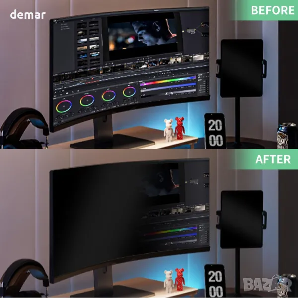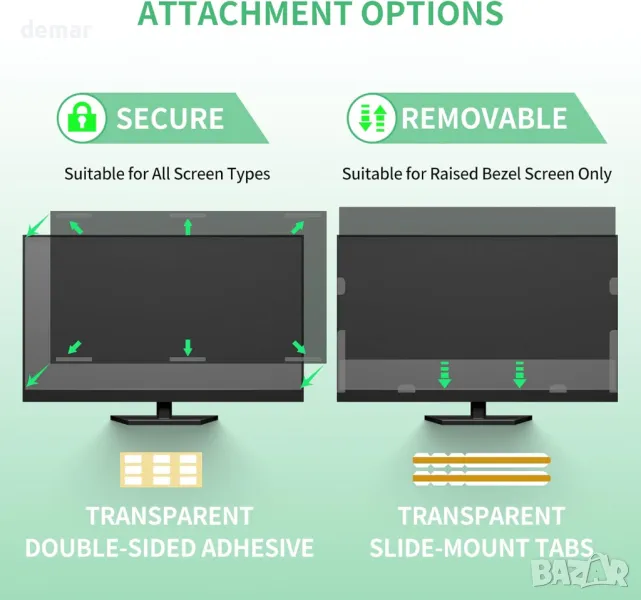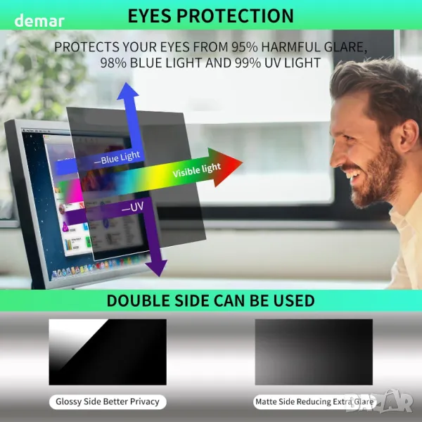 Този екран за поверителност е предназначен за 32" ултрашироки извити монитори със съотношение на страните 16:9 (Действителен размер на филтъра: Ширина: 27,4" (697 mm), Височина: 15,4" (392 mm), Диагонал: 32" (812,8 mm)), предлагащ подобрена поверителност чрез ограничаване на ъгъла на гледане до +/- 30°, така че само тези директно отпред могат да виждат екрана. Осигурява двойна защита чрез намаляване на синята светлина със 70%, филтриране на 97% от UV лъчите. Защитата на екрана от прах и драскотини е лесна за инсталиране или с постоянно лепило, или с подвижен плъзгащ се монтиращ елемент и разполага с реверсивна конструкция с матови и лъскави страни за намаляване на отблясъците.