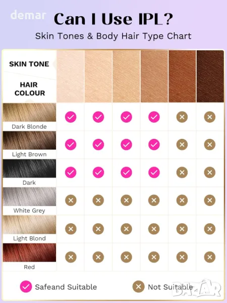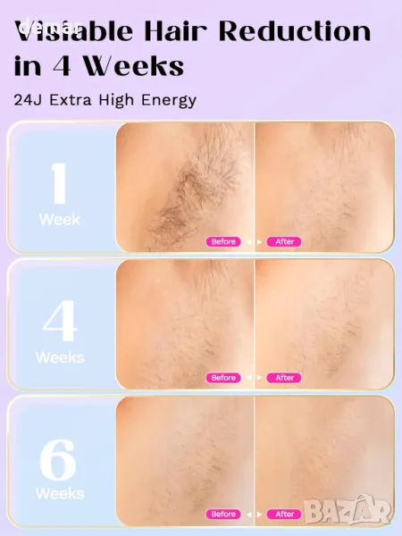 Това професионално устройство за лазерна епилация доставя 24J енергия, насочена към космените фоликули с дължини на вълните между 600 nm до 1200 nm за забележими резултати само за 4 седмици. Той разполага с безболезнена функция за охлаждане с лед, която минимизира дискомфорта, помага за затваряне на порите и стяга кожата. С 5 регулируеми нива на енергия, той осигурява персонализирано изживяване без дразнене. Устройството е предназначено за използване на цялото тяло само за 15 минути, като покрива зони като лицето, ръцете, бикини линията и краката. Предлагайки резултати като в салона у дома, спестява време и пари в сравнение с традиционните методи.