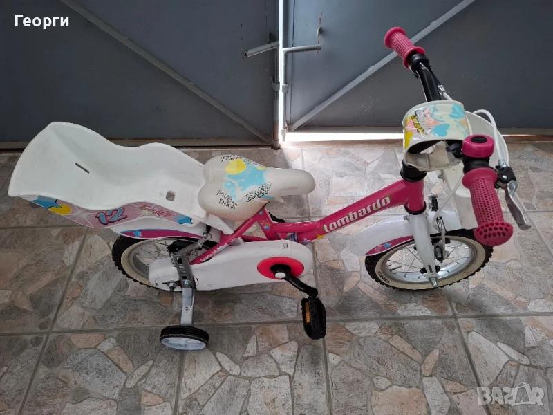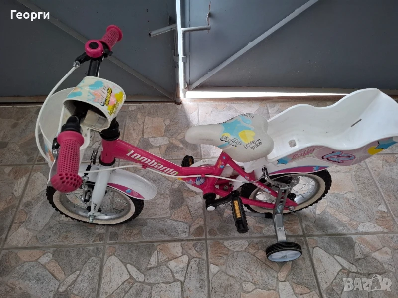 Продавам детски момичешки велосипед Lombardo-12цола в комплект с чисто нови помощни колела,с предна и задна спирачка алуминиеви ,бърз монтаж на седалката, стойка за подпиране,звънче,кошничка и кошница за кукла. Много запазено с минимални следи от употреба нормални за използвано колело,много леко,здраво и качествено!Цена 145лв.