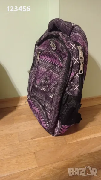 Раницата - тъмно лилаво и черно на ивици е 10 лв.