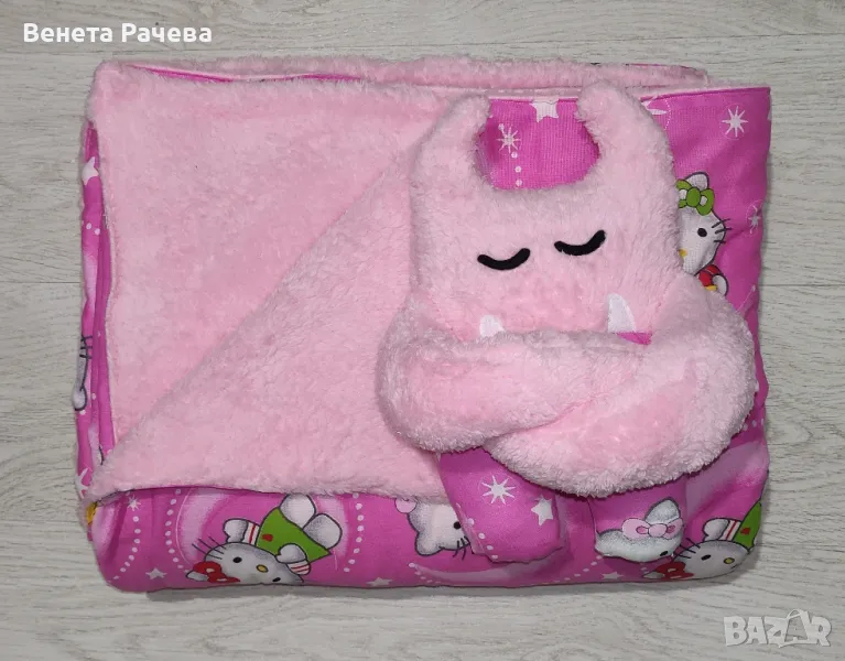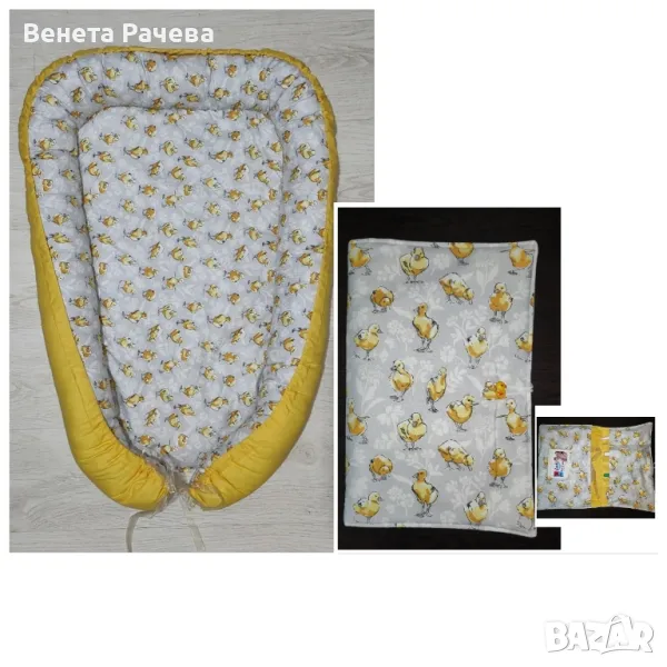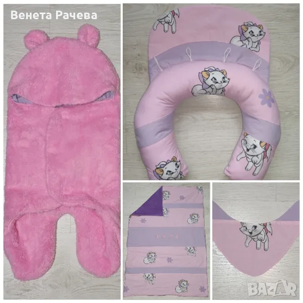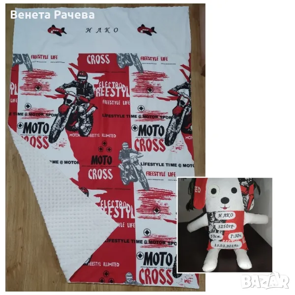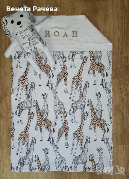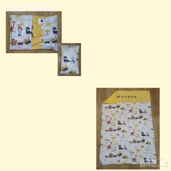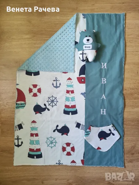 Ръчно изработени бебешки сетове за подарък с артикули по избор, в десени по избор,с възможност за персонализация с машинна бродерия. Възможни всякакви комбинации от одеяло, бандана, играчка за гушкане, органайзер за бебешки аксесоари,клипс за биберон, гнездо, визитка,активна възглавничка и/или пухкаво бебешко чувалче. Посочената цена е за одеяло 60/90 см без персонализация+бандана. За всякакви други комбинации се изготвя индивидуална цена.