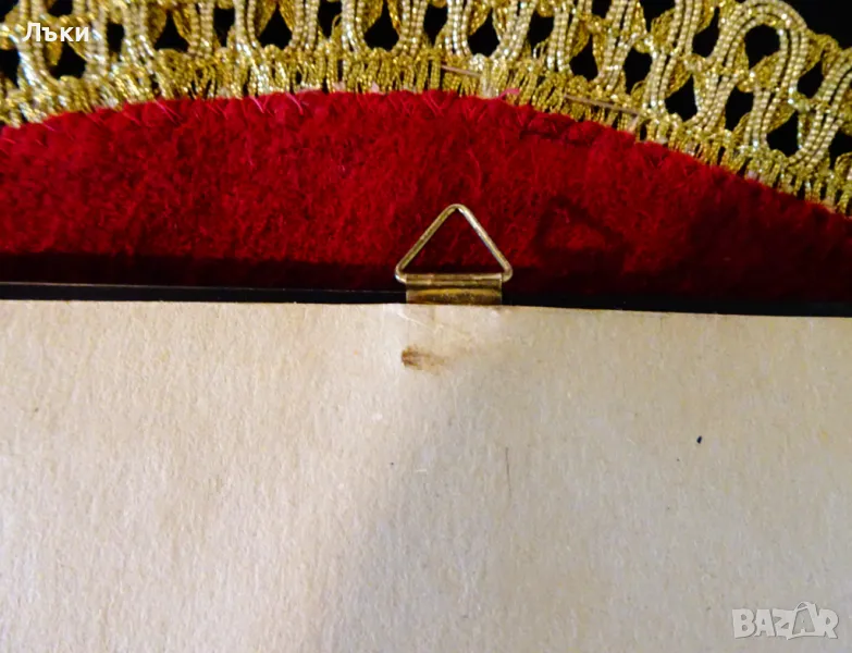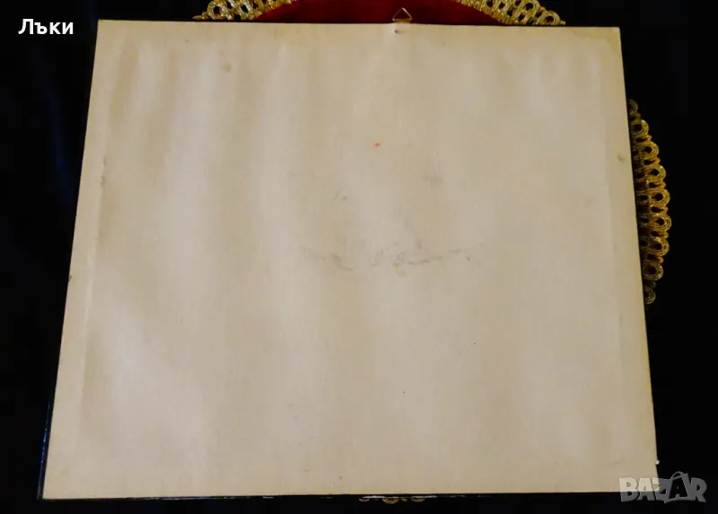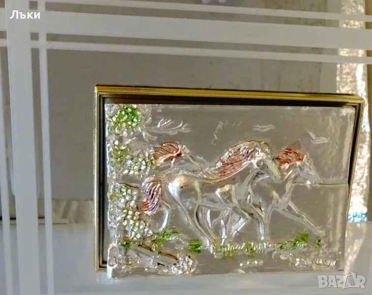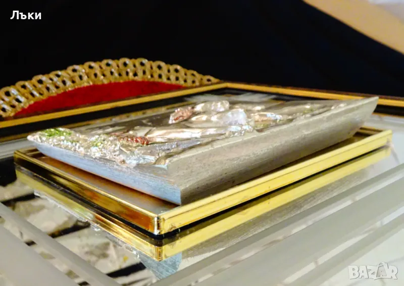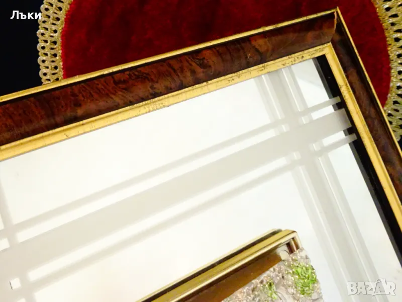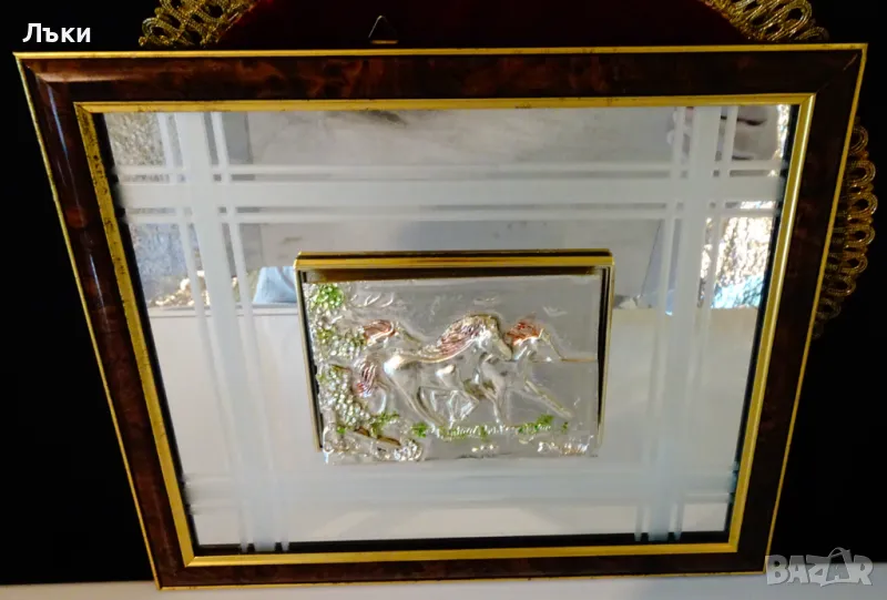 изработена от някакъв тежък материал,който не се вижда,защото има дебело сребърно покритие.Пластиката има позлатена рамка и е закрепена върху огледало,което също има красива рамка.Много ефектно произведение.Размер 33 х 28