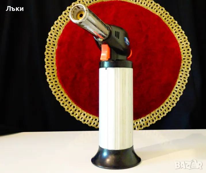 перфектен.Зарежда се с газ за запалки.Височина 17.5 см.,дължина 15.5 см.,диаметър