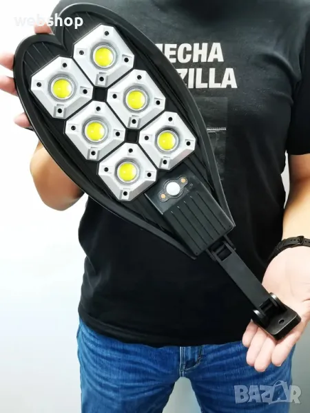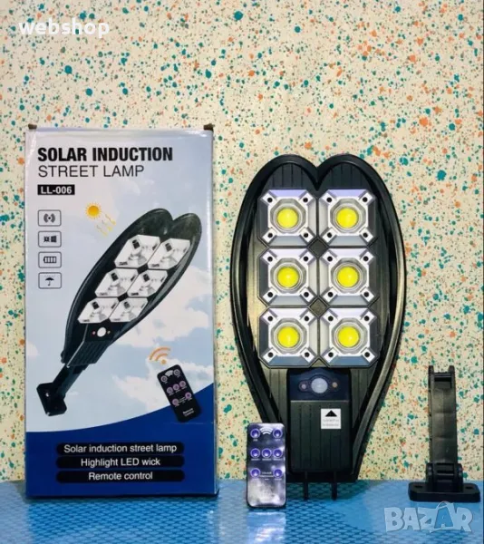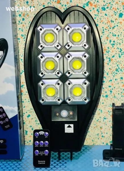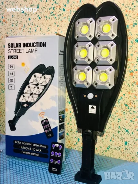 Соларна лампа 200W LL-006. Лампата е 6 COB диода с изключително ярка светлина и включено дистанционно управление. Автономното осветление има 3 режима на работа. Режим: 1.Свети при движение 2.Свети димирано, при движение на 100%. 3 Постоянна осветеност на 30%.