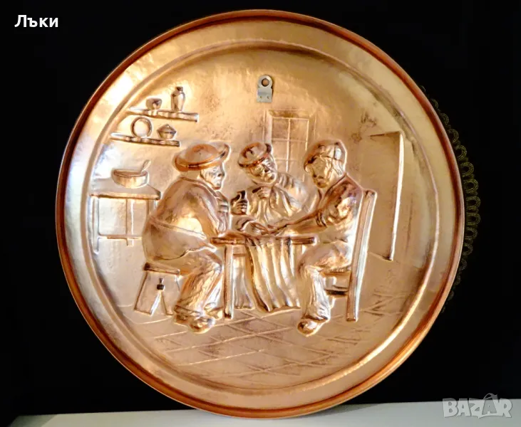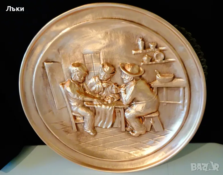 мед.Изобразени са трима мъже,които играят на карти покер в приятна битова обстановка.Има окачалка за стена.Диаметър 33 см.,височина 2 см.,тегло 470 гр.