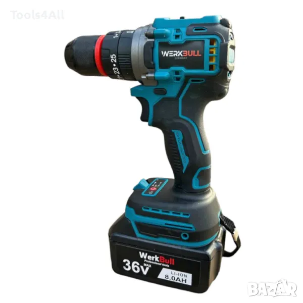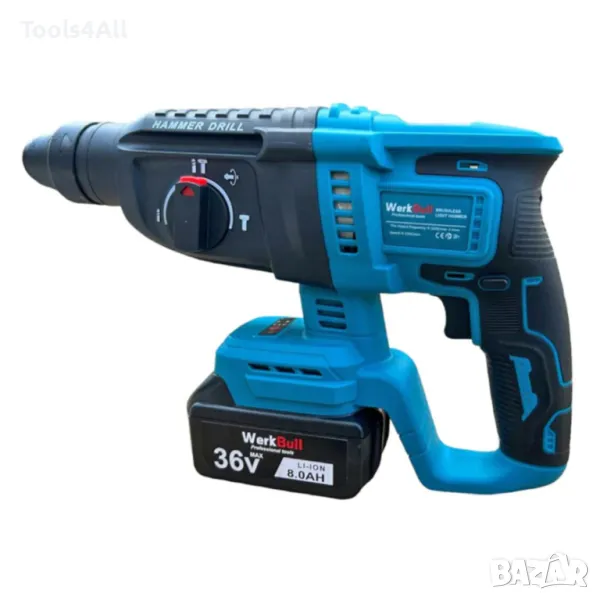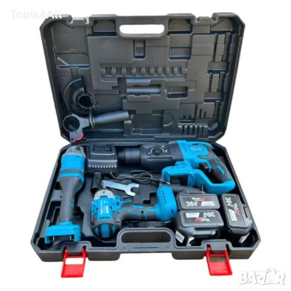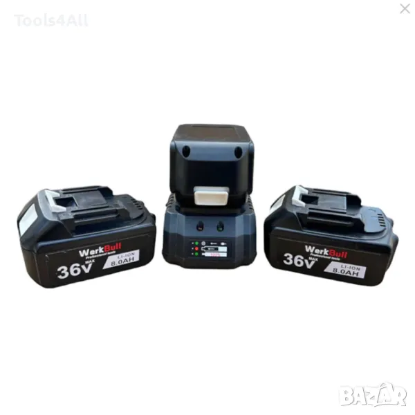 Изпълнете всяка задача с лекота! Комбинираният акумулаторен комплект WerkBull включва перфоратор, винтоверт и ъглошлайф, заедно с 3 батерии 36V 8Ah .