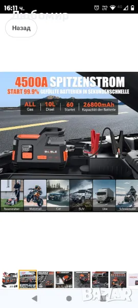 Jump Starter Power Bank 4500 A 26800 mAh Преносим 150 PSI надувател за всички газови или 10,0 L дизелови двигатели 12 V Преносим батериен стартер Power Pack.Чисто нов мощен стартер с 4500 ампера пиков ток, който ви позволява да стартирате автомобила си (до бензинов или 10-литров дизелов двигател) до 60 пъти. Усилвателят на батерията JS006 може надеждно да стартира всички 12V празни батерии лесно и безопасно за 1-3 секунди. Безопасен при екстремни температури от -20 60 така че вече няма да се притеснявате за изтощен акумулатор на кола през студената зима и съхранение през горещо лято.