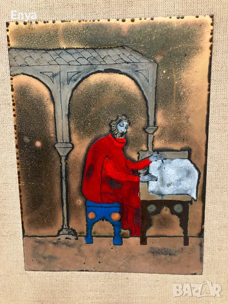 Рисувано е с емайл върху медна основа.
