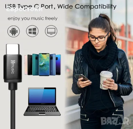 Кабелни слушалки USB тип C. Кабелни слушалки за сън Hmusic са оборудвани с конектор тип C, съвместим с повечето смартфони с USB C порт.