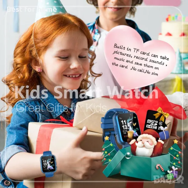 【Камера, видео и музика】 поддържа видео, музика, снимки, рекордер, видеорекордер. Поддържа бърза фотография с едно кликване. Тази камера има 10 рамки за снимки. Децата могат да поставят свои снимки в него и да получат красиви снимки. Снимки и записани аудио и видео могат да се записват на вградената микро SD карта. Можете също така да изтегляте видео и музикални файлове от компютъра чрез USB кабел и да ги запазвате на вградената micro SD карта на детския смарт часовник.