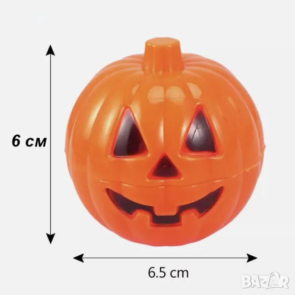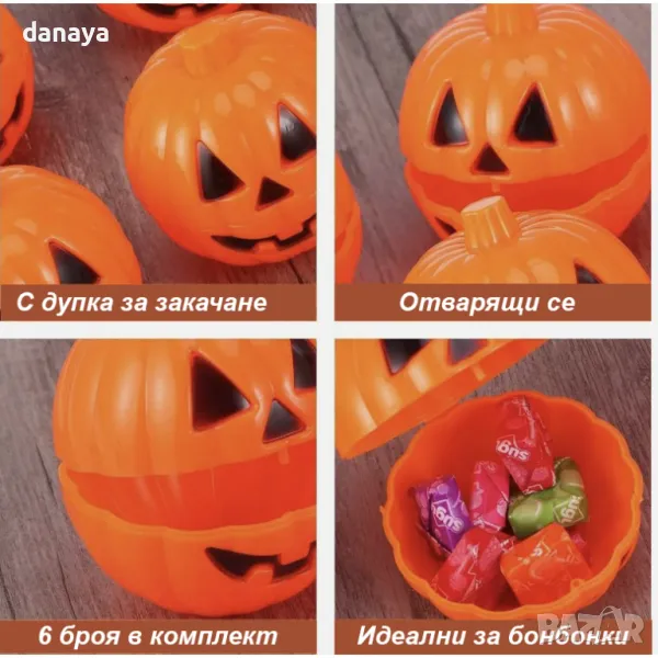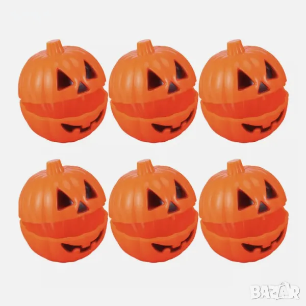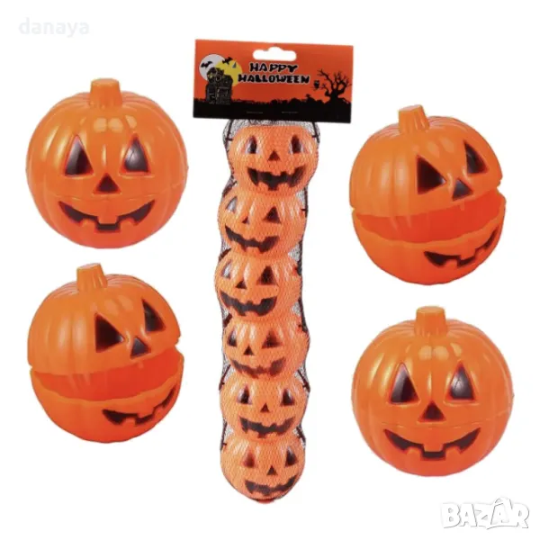 Пластмасови тикви, които се отварят и затварят. Може да се напълнят с малки бонбонки, лакомства, послания изненади и да се подарят на децата за Хелоуин. Освен това могат да бъдат чудесна декорация за Halloween. Всяка тиква има дупка, в която може да се сложи връвка за закачане на стена, врата.