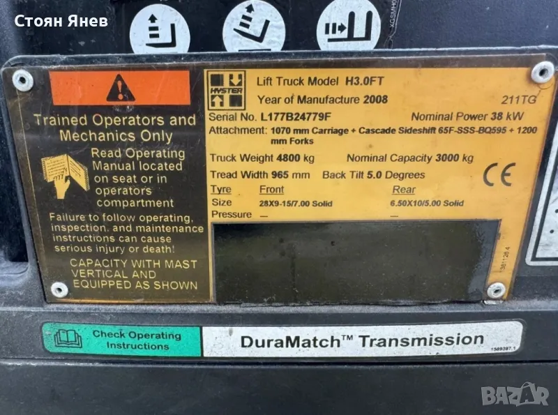 Мотокар Hyster 3.0 - 3 тона - 2008 година - 4500 часа → Обява 47244555
