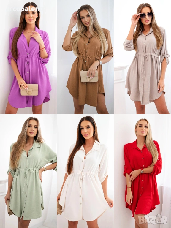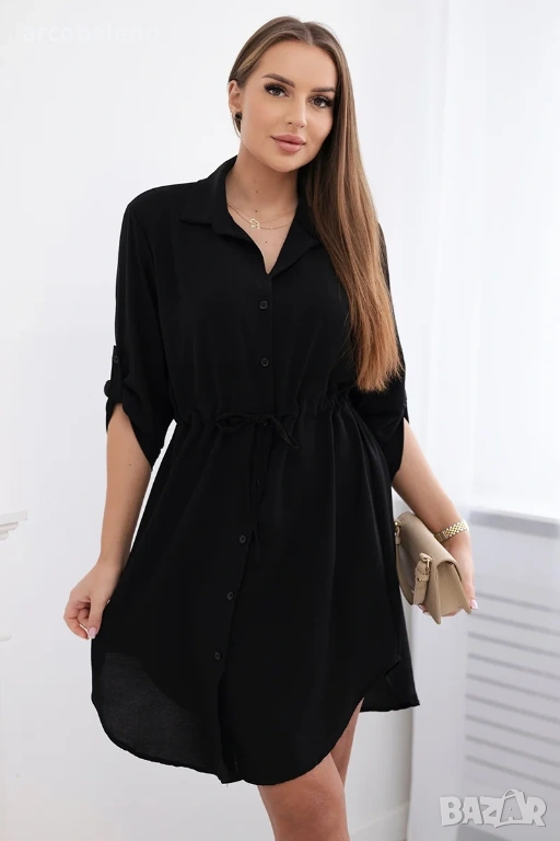 Рокля с копчета, връзка на талията и яка е комбинация от елегантност и изтънчен чар в едно. Копчетата придават класа и стил на роклята, като в същото време позволяват лесно обуване и събуване. Връзката на талията подчертава женската фигура, като й придава индивидуален характер и гарантира перфектно прилягане. Яката придава елегантност и изтънченост, придавайки на роклята деликатен и изтънчен акцент. Той е идеален вариант за различни поводи, от бизнес срещи до романтични срещи, като същевременно гарантира комфорт и модерен вид. Размерът е универсален и ще бъде подходящ за жени, носещи размер S, M или L.