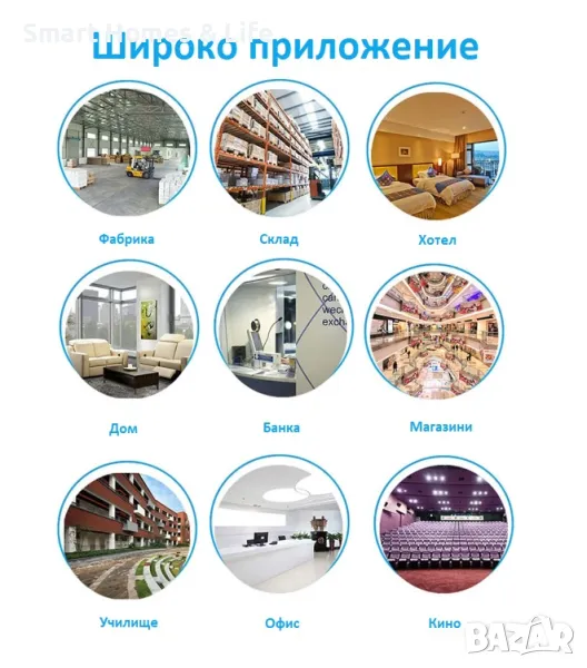 системи с мобилно приложение, магнитни сензори за врати и прозорци, сензори за дим / пушек, наводнения, въглероден оксид, газ, обемни сензори, Micro SD карти, смарт сензори за управление на влажност и температура, безжични водоустойчиви външни звънци, сензорни осветления, смарт управления за домакински уреди и много други продукти.
