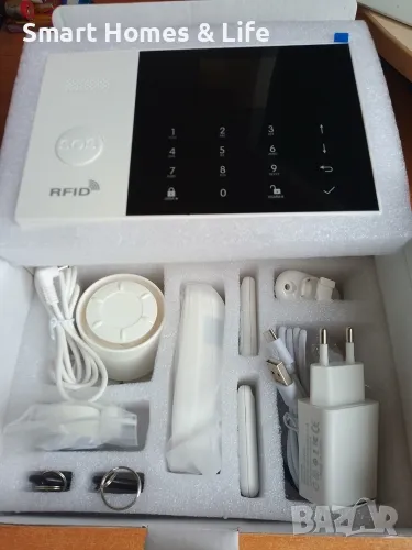 Контролният панел поддържа безжична връзка с обемни сензори за движение, магнитни датчици за врати и прозорци, детектори за дим,