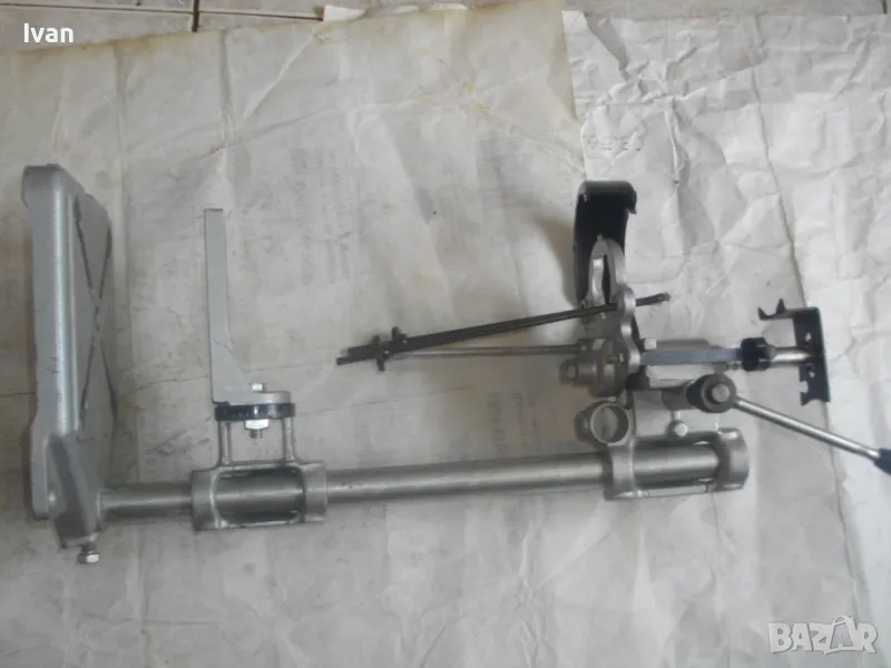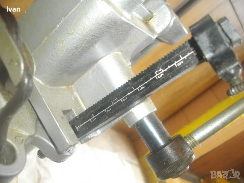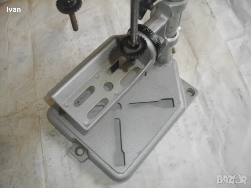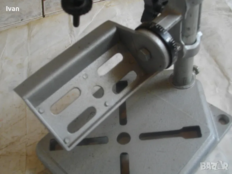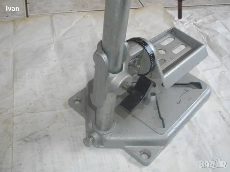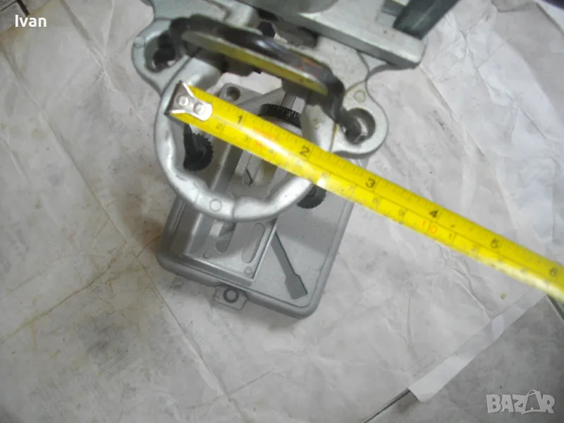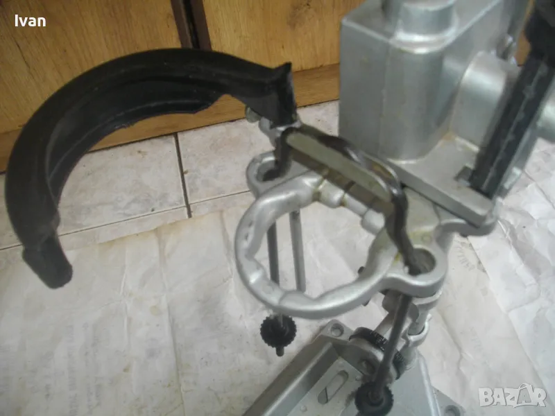 ОПИСАНИЕ на нова стойка ф 43мм за пробиване под ъгъл с въртелива функция - ход 65 мм - сив цвят - цена 249 лв. Съвсем нова, неизползвана и неупотребявана стойка за бормашина за специализирано пробиване - право и под ъгъл - с възможност регулация на пробива до 180 градуса. Не е упоменато произовдство на стойката. Надписи по нея: