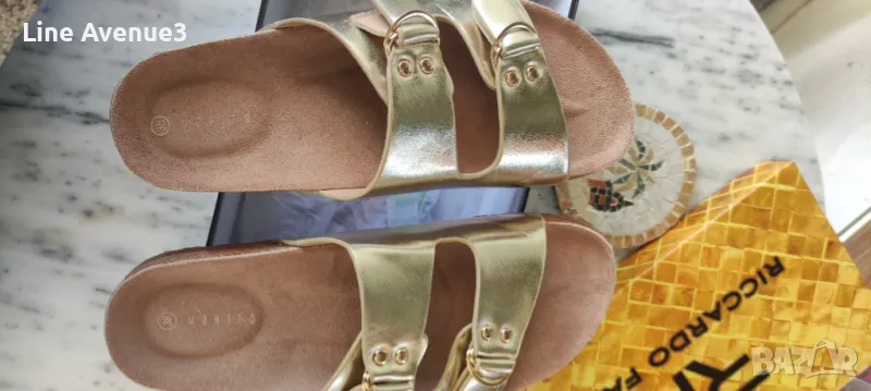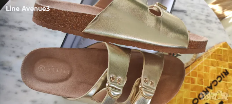 Модерни италиански чехли в златист цвят с елегантни метални катарами! Подметката е изработена от корк .а отдолу за мекота на движението и поставен млечен каучук! Стъпалото е ортопедично излято!