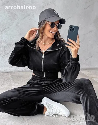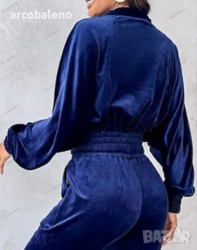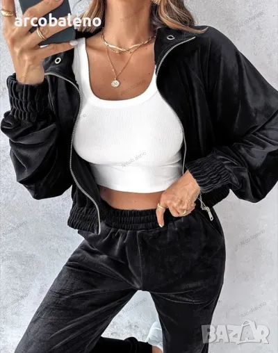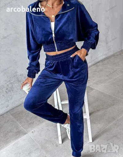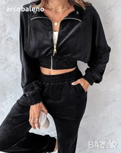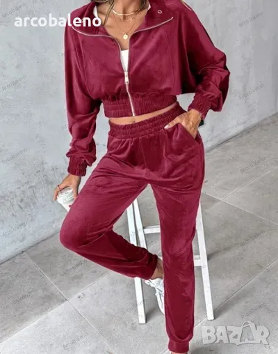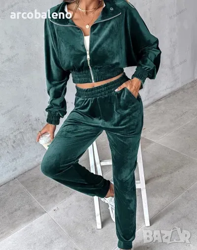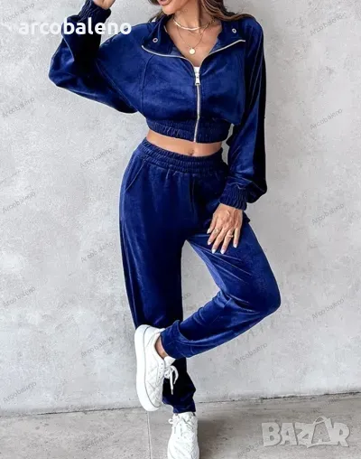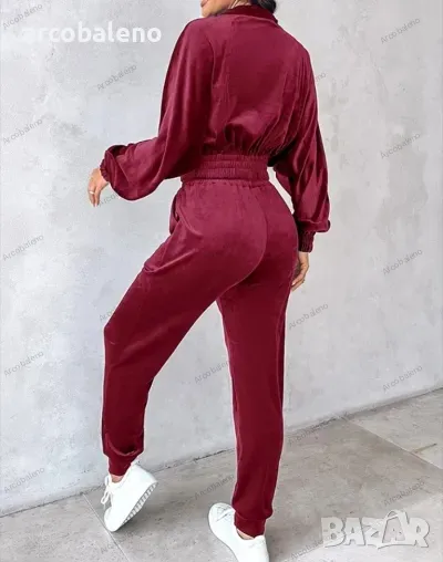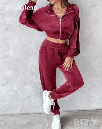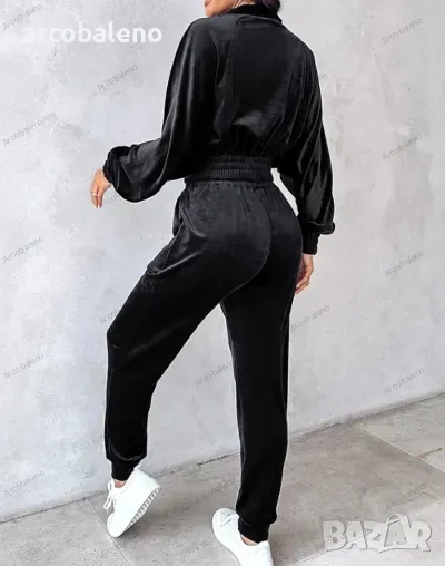 Дамски едноцветен спортен кадифен костюм с дълги ръкави за свободното време