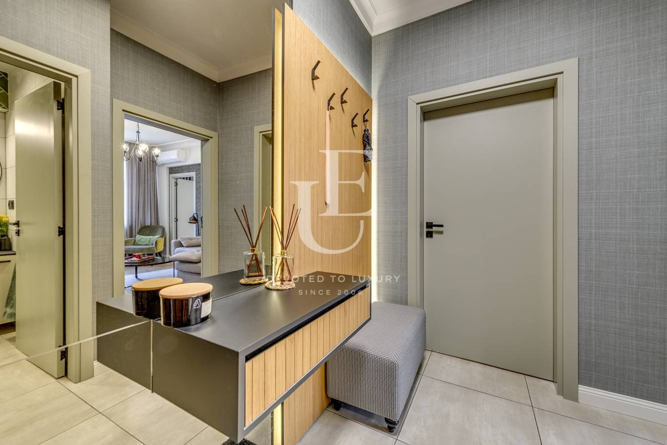 Апартаментът се намира на четвъртия етаж в добре поддържана сграда. Входното антре води до светъл и просторен дневен тракт с големи прозорци, които позволяват изобилие от естествена светлина. Дневната е отворена към кухнята, която е оборудвана с висококачествени уреди.