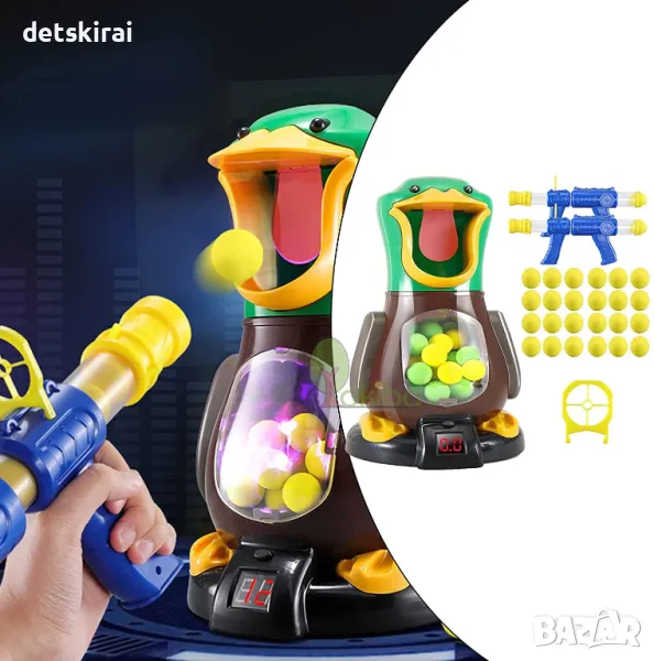 ПОПАДАНЕ В ЦЕЛТА-Стрелбата по мишена изисква от детето да се концентрира, като по този начин придобива умения за координация между ръцете и очите.Всичко, което трябва да направите, е да ударите езика на патицата с топче от пяна, топчето ще падне в корема на патицата и на брояча ще бъде отчетена точка.
