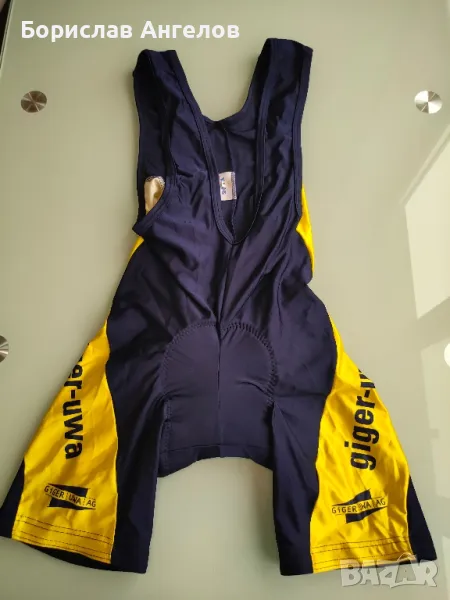 Мъжки велоекип с надпис Festina, размер S, вело клин и тениска с къс ръкав, цвят синьо и жълто, със задни джобове и скрито закопчаване.