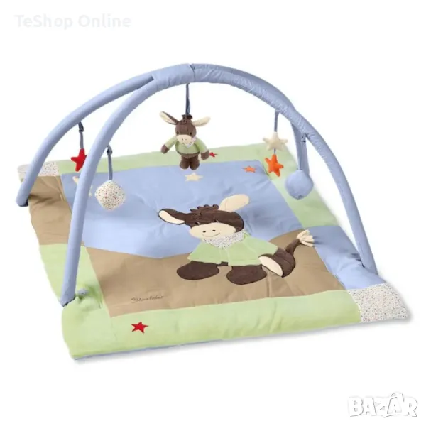 Мека подплатена арка за игра за бебета на възраст 0-18 месеца с висящи фигурки и мотив на сладко магаренце Еми