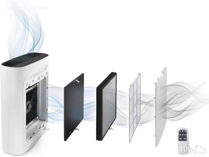 6-посочна филтърна система: Този пречиствател на въздуха има 6-посочна филтърна система с предфилтър + H14 HEPA филтър + филтър с активен въглен + UV-C светлина + фотокатализатор + йонизация