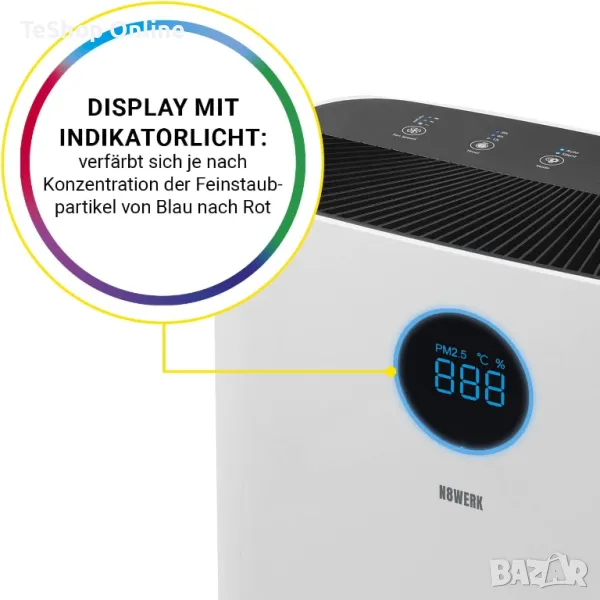 Дисплей със светлинен индикатор: показва влажност, околна температура и концентрация на фини частици в (PM 2,5), обезцветява според концентрацията на фини частици фин прах от зелено до червено