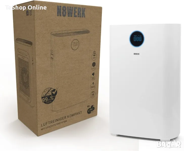 N8WERK Пречиствател на въздух с 6 филтърна система | H14 филтър | CADR: 355 m³/h | Филтрира полени, прах и бактерии | Контрол на приложението | Включва UVC светлина | 80 м² стаи