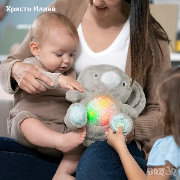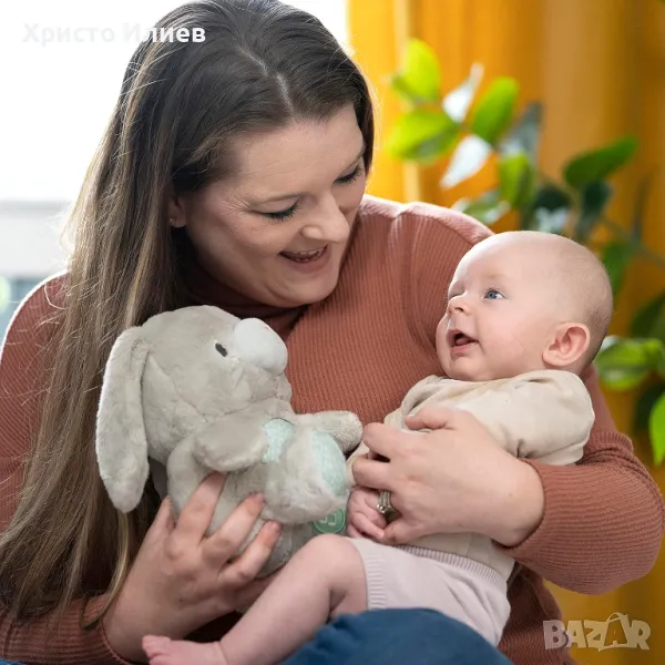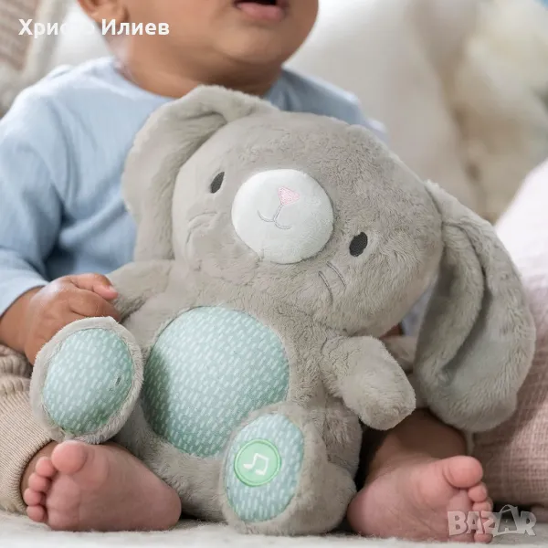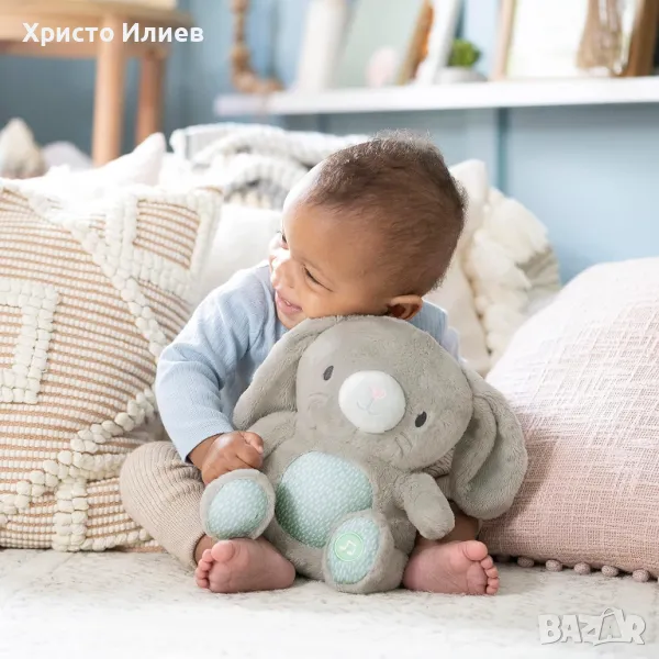Плюшена играчка Зайче със светещо коремче вибрации и музика за приспиване
