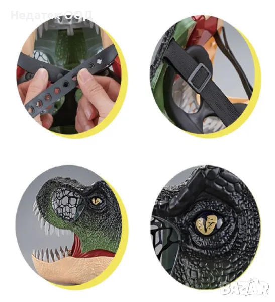 Маска на динозавър T-Rex с реалистични ревящи звуци и светлина в очите. Регулирайте дължината от ремъка, за да пасне добре под брадичката ви, и регулирайте ремъка в задната част на главата, за да пасне правилно на главата ви. След като отворите устата си, устата на маската на динозавъра също ще се отвори. При леко отваряне на устата ще чуете дишането на динозавъра, при напълно отворена уста ще се чуе рев и очите ще светнат. Работи с 3 батерии тип AG13 (включени).