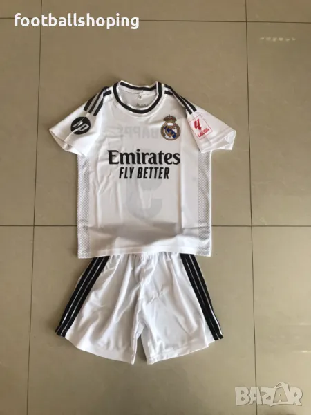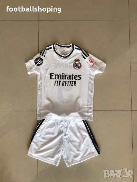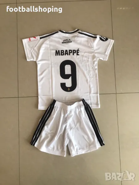 Детски футболни екипи на новата звезда на Кралският клуб Реал Мадрид - Килиан МБАПЕ номер 9. Екипите са българско производство. Разполагаме с бели или черни къси гащи към екипа. Налични размери: от 116см до 164см. Изпращаме до офис на Еконт. Гарантирано качество на изработка