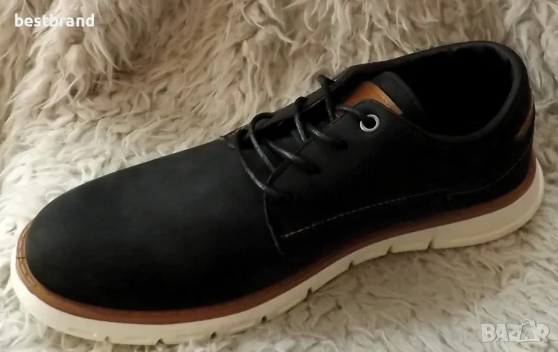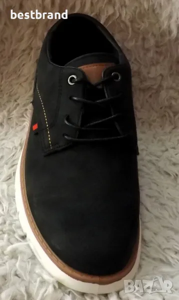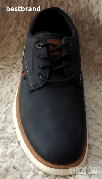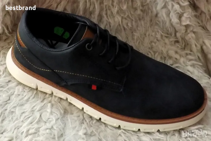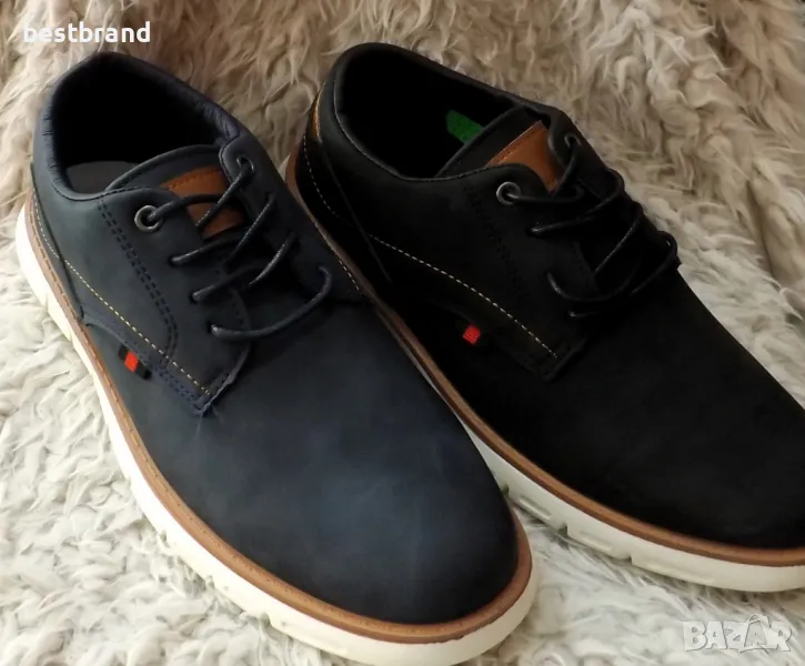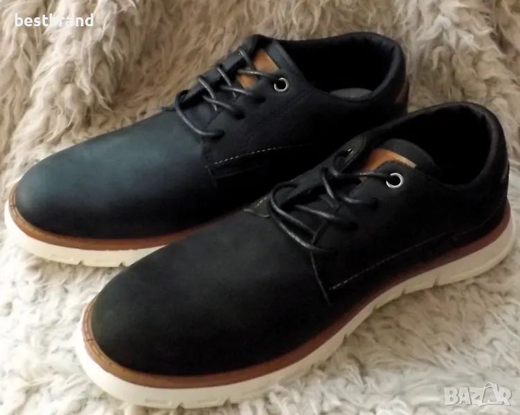 Мъжки спортно-елегантни обувки ,с връзки, в два цвята - тъмносин и черен. Моделът е изработен от изкуствена кожа, но мека, и е с меки стелки. Подметката е бяла с кафява ивица за акцент. Отговарят си на номерата .