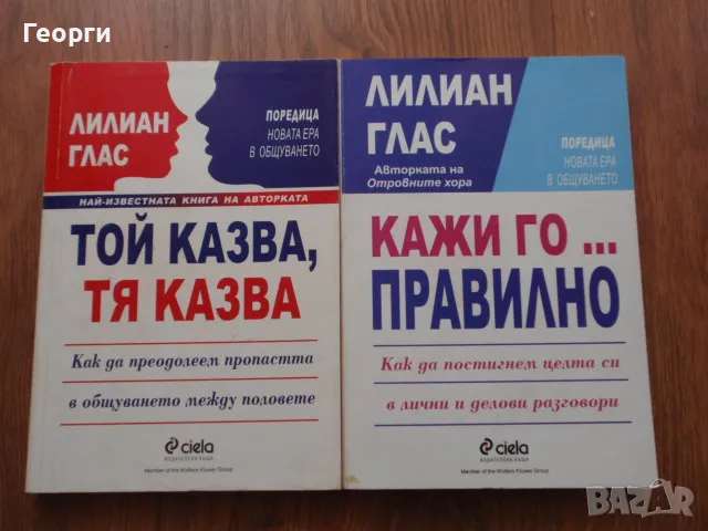 - "Той казва, тя казва" (Как да преодолеем пропастта в общуването между половете) - Лилиан Глас, изд. "Сиела" 1999, много добро състояние, цена 7 лв.