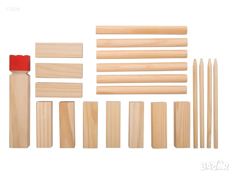 - Включени: 1 цар, 10 бр. дървени блокчета, 6 бр. пръчки за хвърляне, 4 бр. ъглови пръчки