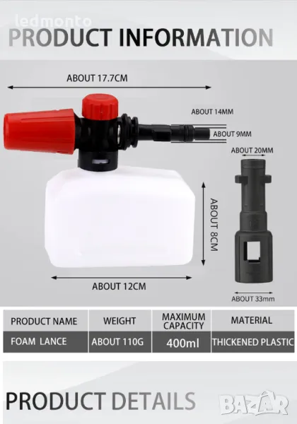 Този **пенообразувател** прави почистването на автомобила по-лесно и забавно, осигурявайки гъста пяна и ефективно отстраняване на замърсяванията. За повече информация или поръчка, свържете се с мен!
