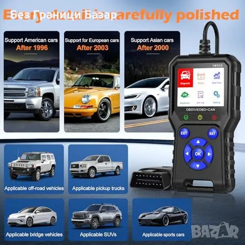 Широка съвместимост: Работи с повечето автомобили от САЩ (след 1996), Европа (след 2003) и Азия (след 2008).