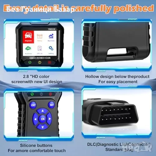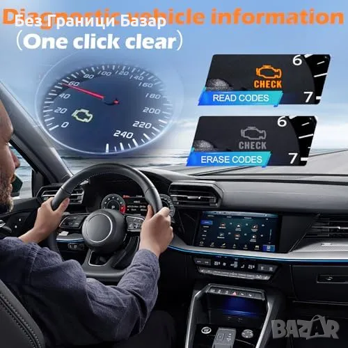 10 OBDII функции: Четене и изчистване на кодове, тест на батерията, O2 сензор и още.
