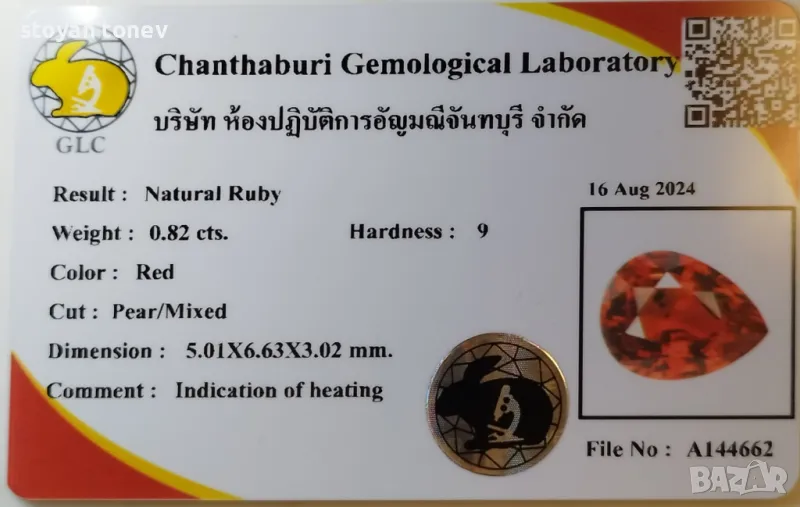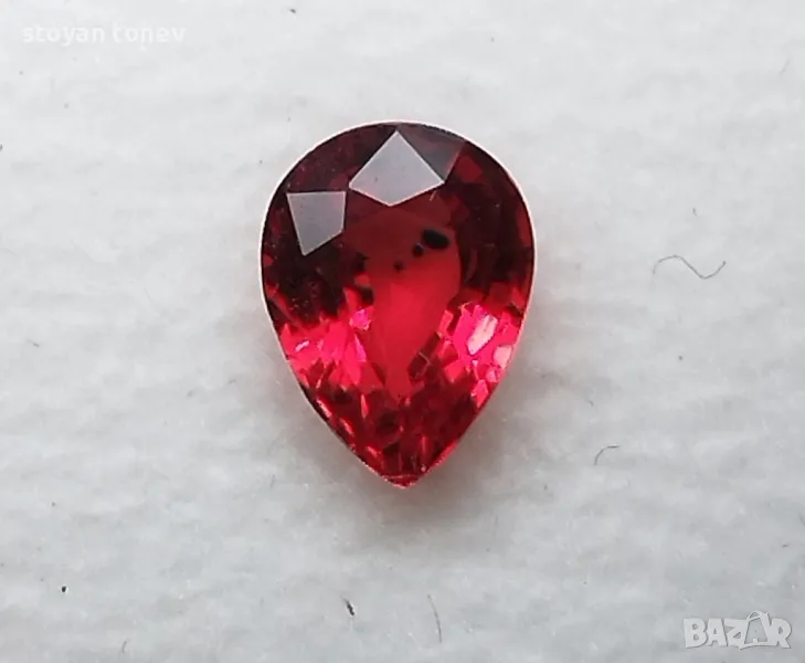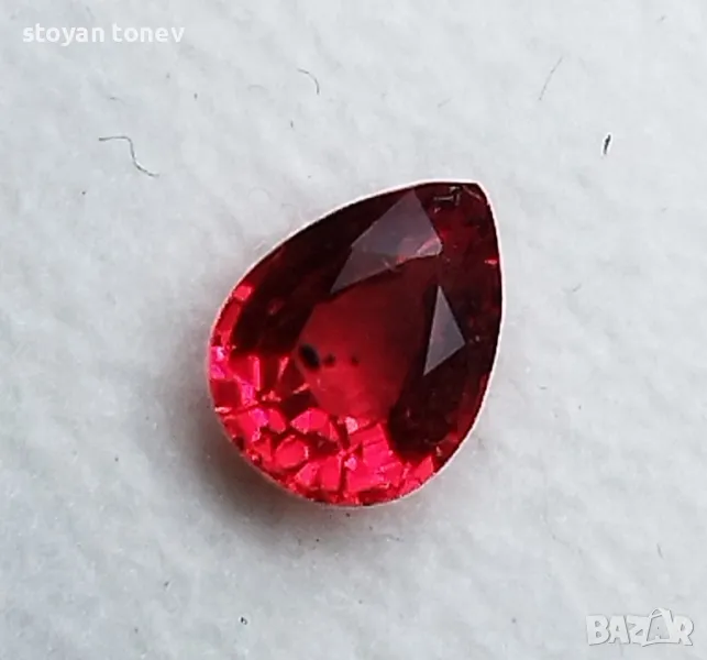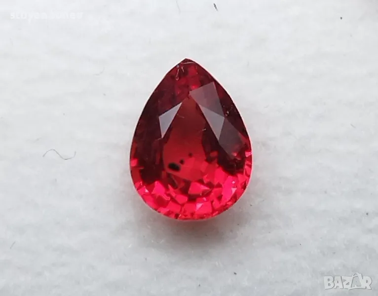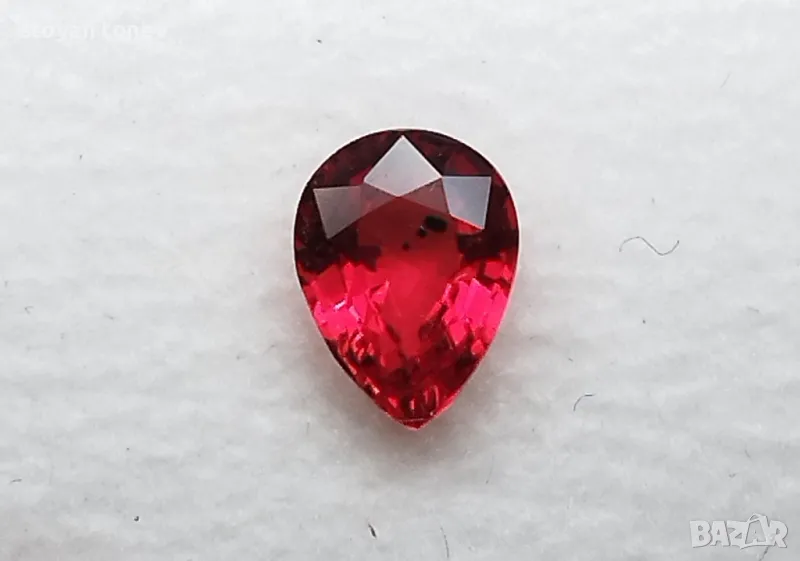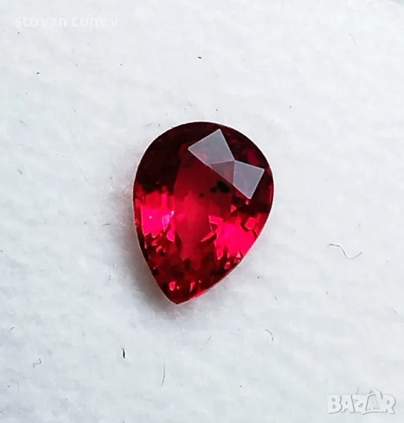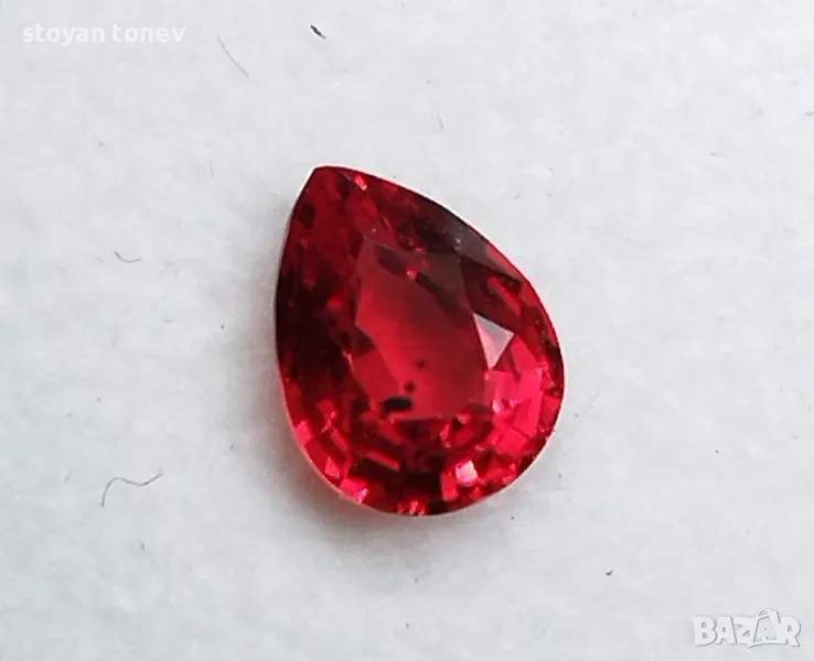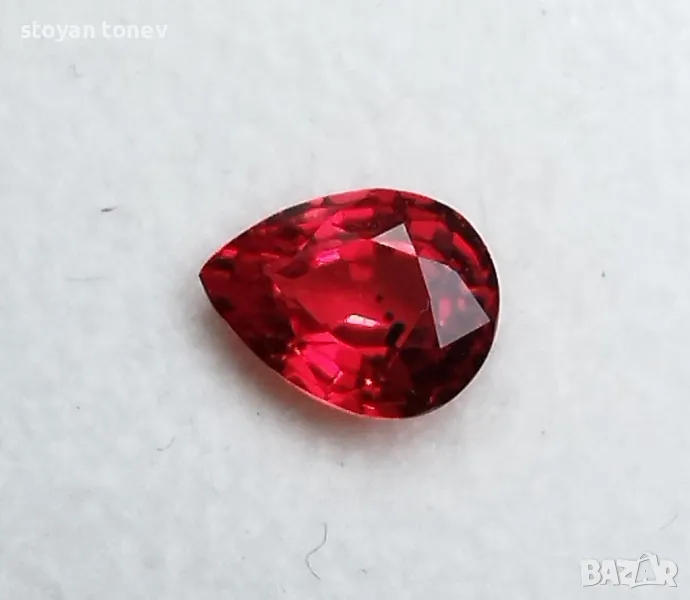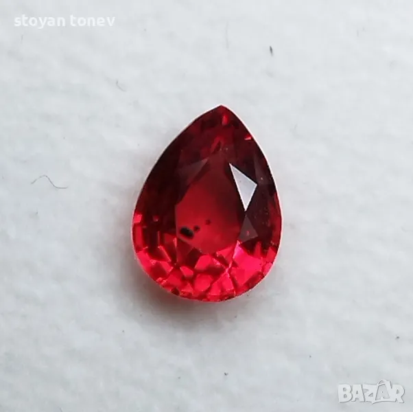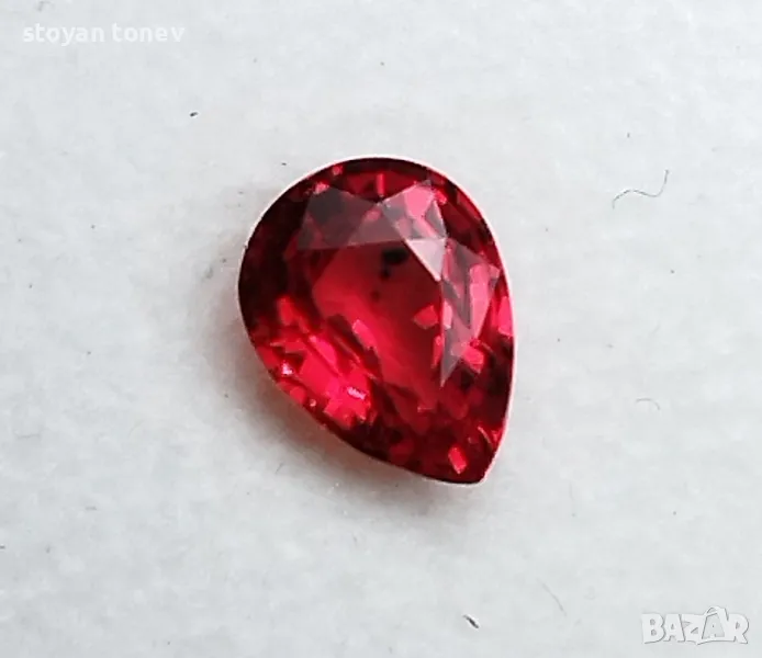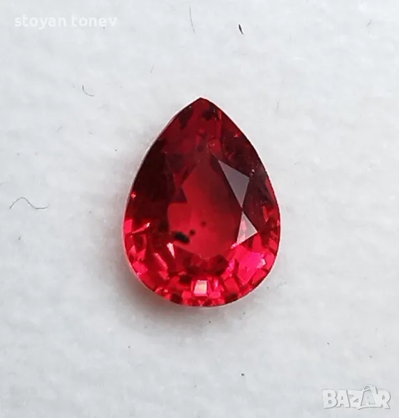 рубин с тегло 0.82кт. и произход Мадагаскар. Чистота VVS без никакви включения видими с невъоръжено око. Цвета е червен. Форма круша с размери: 6.63 x 5.01 x 3.02mm.