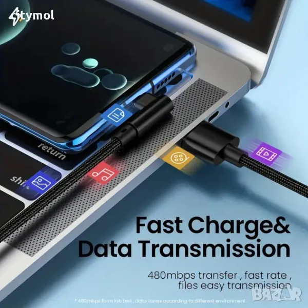 90° ъглов кабел USB A към USB C - USB 2.0 480Mbps, за бързо зареждане до 80W (нужно е подходящо зарядно устройство)