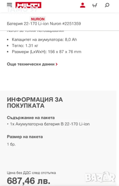 Продавам акумулаторна литиево-йонна батерия на Hilti от новата NURON серия. Батерията е 22V 8.0Ah с индикатор произодство от 2024г. внос от Франция. Имам налични 2 броя останали, обявената цена е за една батерия може пакетна цена за двете заедно за 680лв. Пращаме с преглед и тест с куриерска фирма еконт може и лично предаване за гр. Шумен.