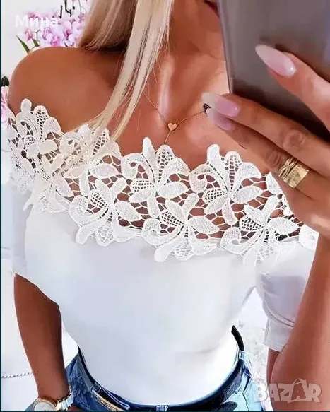Елегантна блуза в бяло с къс ръкав и отворено деколте с плетена дантела.