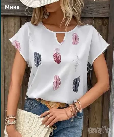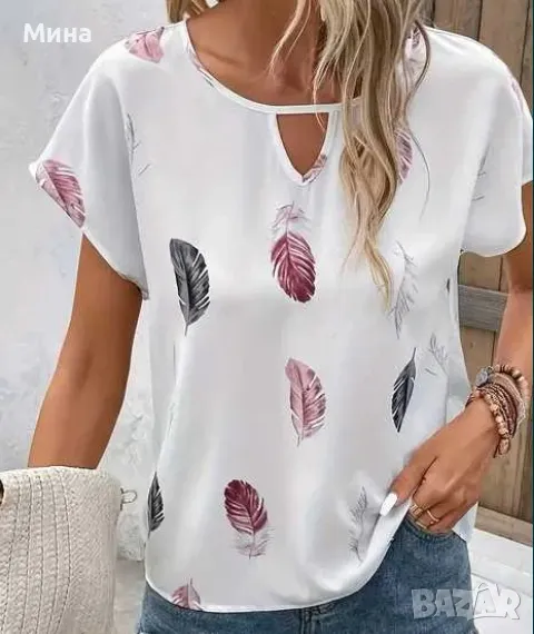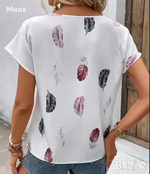 2. Добавете ефирност към гардероба си с бялата блуза с къс ръкав и нежен принт на пера! Лекота и елегантност за всеки ден.