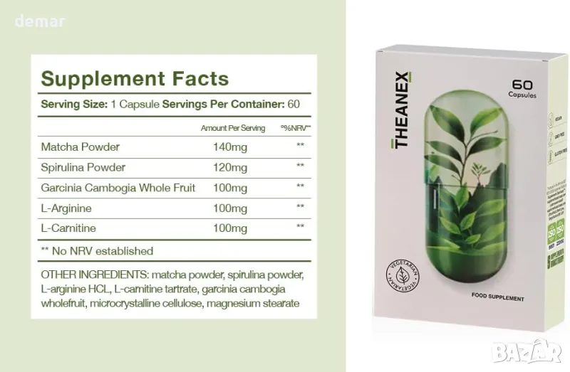 Theanex Добавка за естествен контрол на теглото, 60 капсули, веган, без глутен