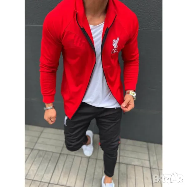 Мъжки футболен екип FC LIVERPOOL, червено и черно, полиестер. Емблемите са везани. Страхотен модел анцуг от дишаща материя, подходящ за сезона пролет-есен. Горнището има 2 джоба, долнището също има 2 джоба. Всички джобове са със ципове. Долнището е стеснено по крака.