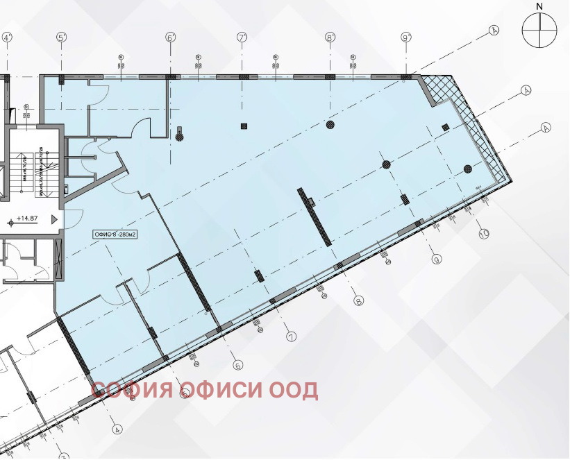 Офисът е разположен на висок етаж с офис сградата и предлага голяма опън спейс зона с тераса, зона за рецепция, конферентна зала, мениджърски кабинет, самостоятелен кухненски бокс с място за хранене, сървърно помещение и 2 WC. Разпределението на офиса може да се променя, съгласно нуждите на наемателя.