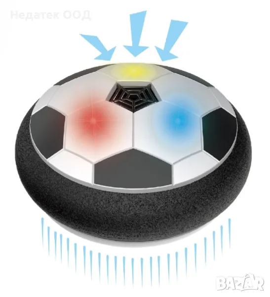 Футболен комплект с въздушна топка, която плува върху всяка гладка повърхност и 2 врати, червени и зелени, 30x20 см с мрежа, фиксирана отдолу с вендузи. За вътрешна и външна употреба. Работи с 4 AA батерии (не са включени).