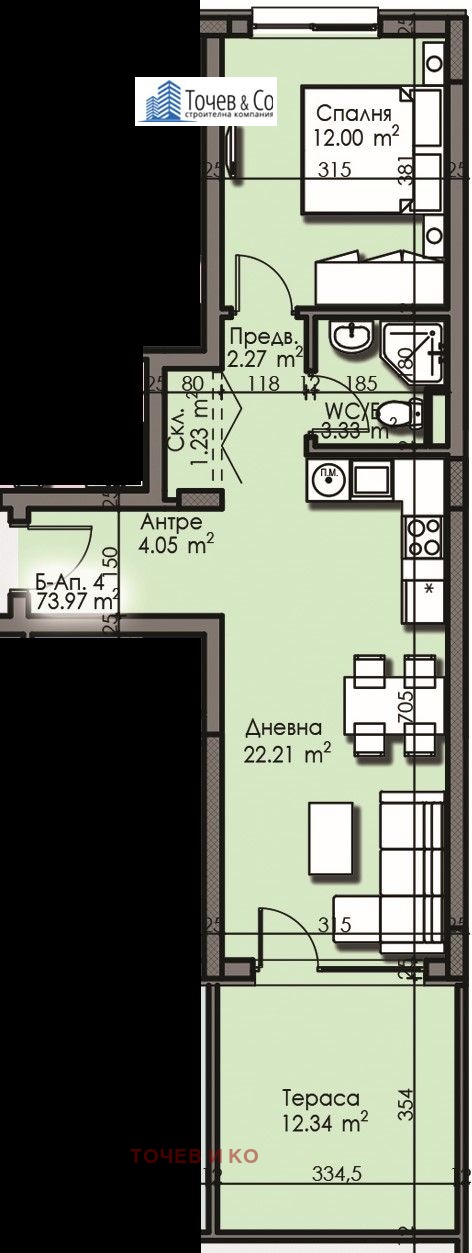 Квадратурите на апартаментите са между 31,21 кв.м и 178,10 кв.м. АПАРТАМЕНТ Б-4.