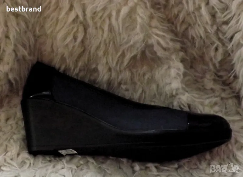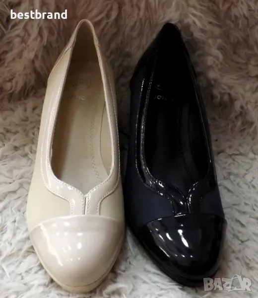 Дамски ежедневни обувки на не висока платформа в комбинация с лак, от изкуствен материал. Обувките са много леки и си отговарят на номерата. Височина на подметката в предната част- 2,5 см., а към петата- 6,5см. Моделът се предлага в два цвята- тъмно син и светло бежов.