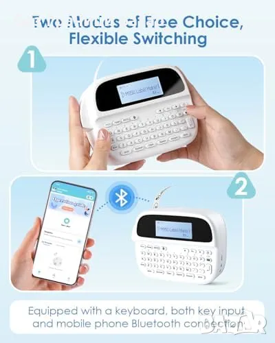 Две метода на печат: Bluetooth връзка с мобилен телефон или физическа клавиатура.